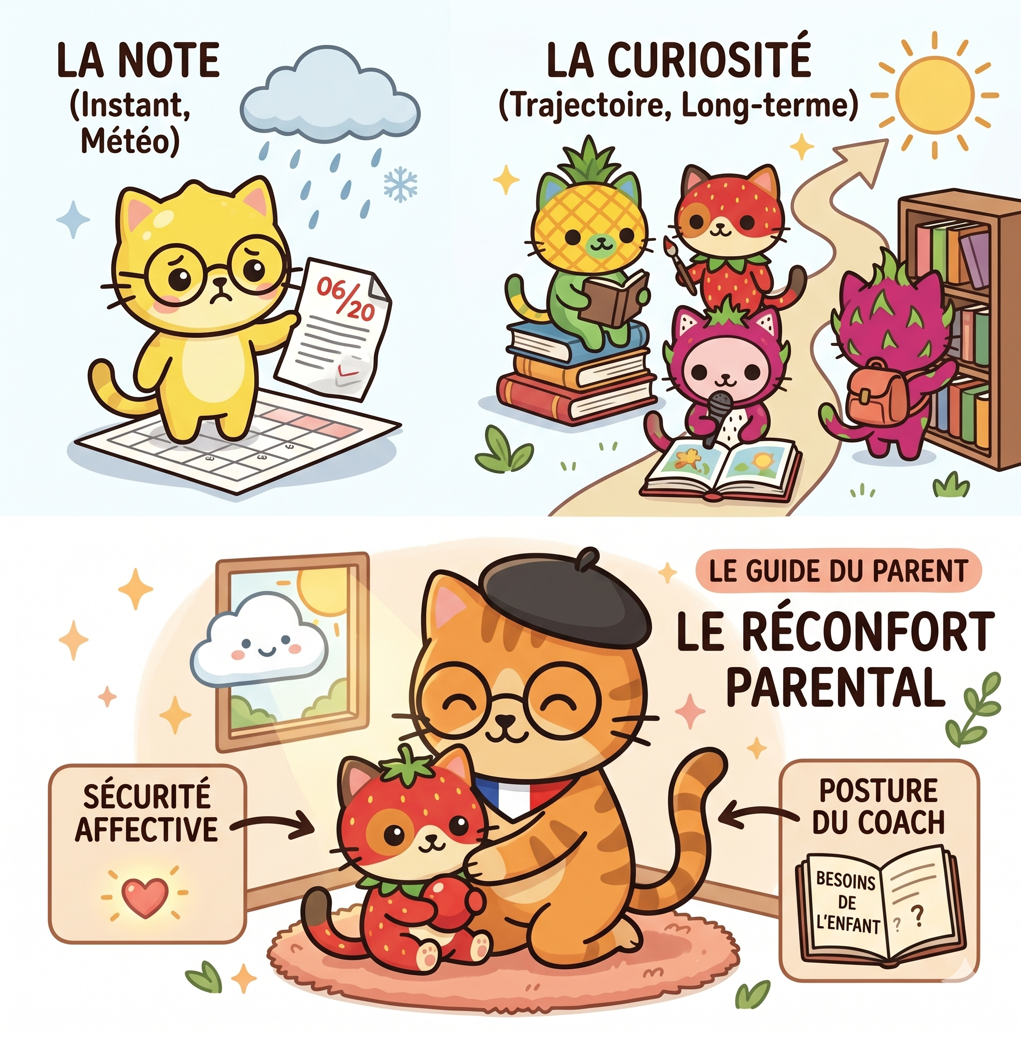 La note est une météo, pas un verdict : Un mauvais résultat indique seulement qu'une notion n'est pas acquise aujourd'hui. Le cerveau est plastique : rien n'est figé.