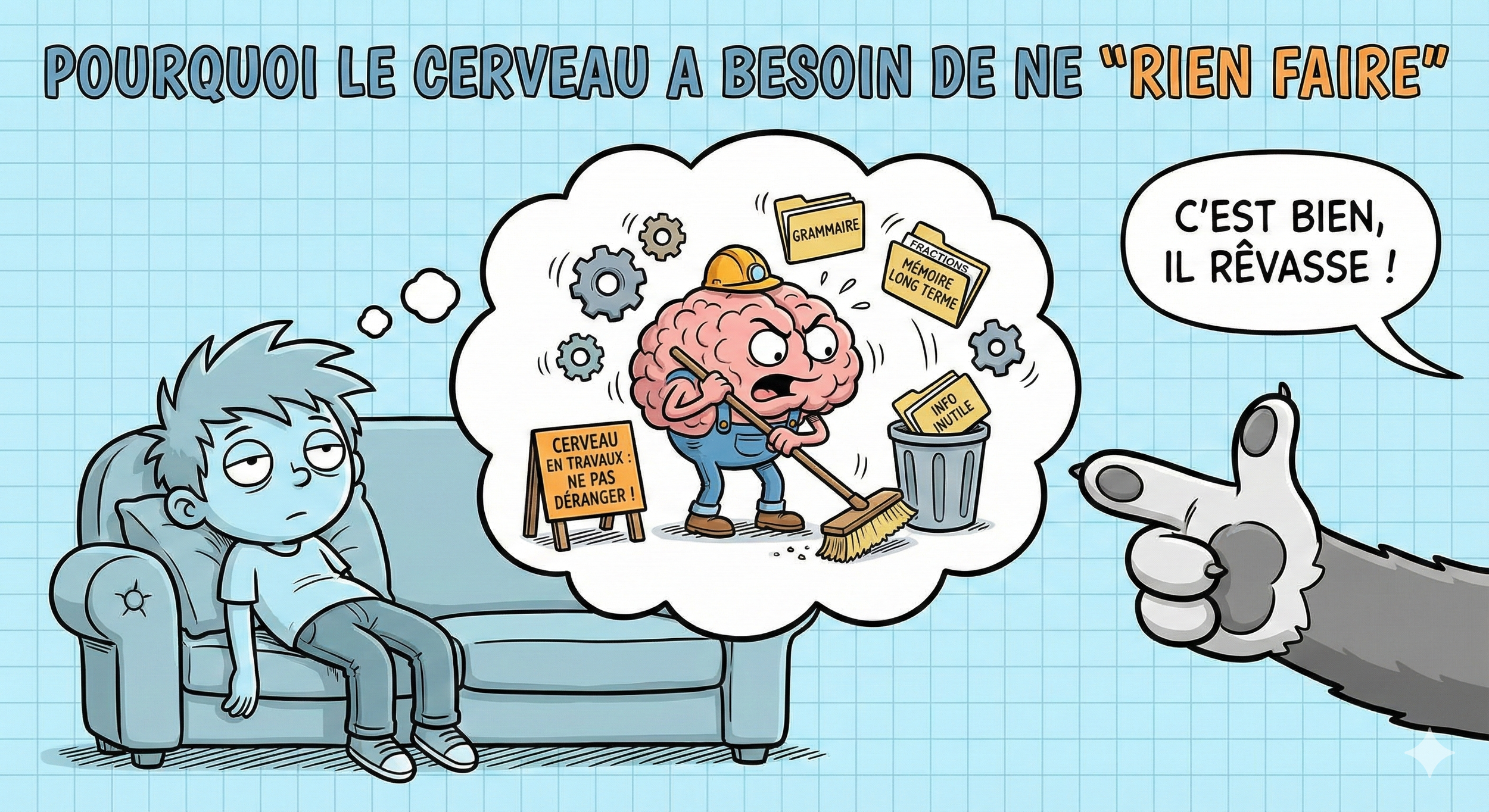 Il passe en ce qu'on appelle le "réseau du mode par défaut". C'est le moment où le cerveau trie, organise et consolide toutes les informations reçues pendant le trimestre. C'est là que les leçons de grammaire du CE2 ou les fractions du CM1 passent de la mémoire de travail (court terme) à la mémoire à long terme.